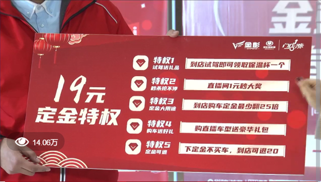 此次直播活动的圆满成功,除了四款车型自带的市场热度外,“19元定金权益卡”的设置也功不可没。参与直播活动的消费者或经销商,只要预付19元定金,即可获得“19元定金权益卡”,持有权益卡的用户可享受5大权益:1.到店试驾可领取保温杯;2.直播间1元秒小米充电宝、小爱智能音箱、米家负离子便携吹风机;3.到店购车定金最少翻25倍(抵500元);4.购车赠送半球家用电饭煲1台、20万元保险及1年免费保养服务;5.下定金不买车,到店还可退20元。试问有谁能抵挡住这样的诱惑呢?