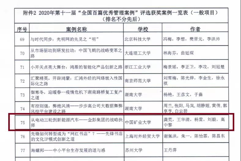 9月23日,第十一届“全国百篇优秀管理案例”评选结果揭晓,中国矿业大学以金彭集团创业历程为教学案例的《从电动三轮到新能源汽车——金彭集团的战略抉择》成功入选!这是中国矿业大学入选全国“百优”的首篇案例,也是电动车行业唯一入选的经典案例。