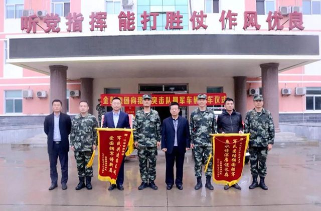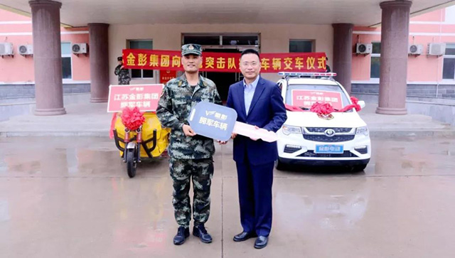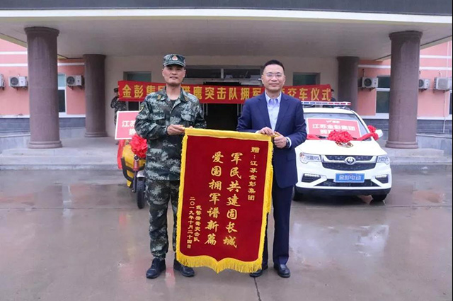 活动最后,金彭集团总裁刘志培向猎鹰突击队交接了拥军车辆,猎鹰突击队为江苏金彭集团授予拥军锦旗,多方领导共同合影留念。