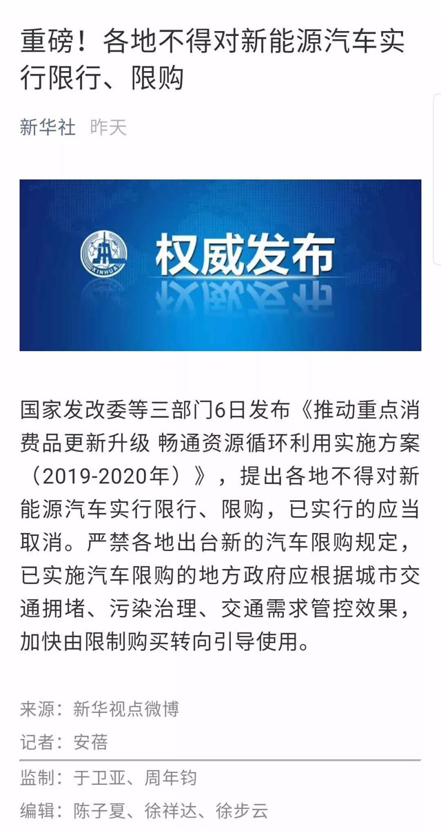 新华社权威发布!各地不得对新能源汽车实行限行、限购