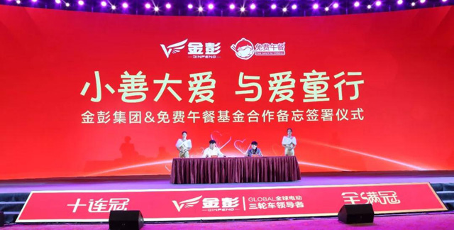 早在2018年1月举行的年度盛典上,金彭与中国社会福利基金会免费午餐基金签署协议,达成长期战略合作,金彭承诺自2018年起,每卖出一辆金彭电动三轮车,就会向免费午餐基金捐赠一元钱,每年向免费午餐基金捐赠不少于100万元用于帮助中国贫困地区留守儿童免于饥饿、健康成长,预计三年累计受惠学童75万人次。