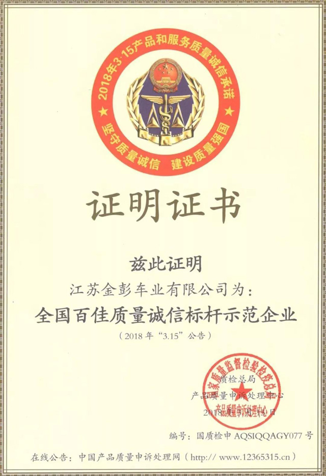 努力,让自己更出色。2018年,金彭制造了太多大事件,虽谈不上惊天动地,但在业内绝对称得上首屈一指。付出,总会收到回报。2018年3月,金彭被国家质量监督检验检疫总局评选为“全国百佳质量诚信标杆示范企业”,同时获得此项殊荣的还有华为、格力、海尔、联想、小米等国民品牌。