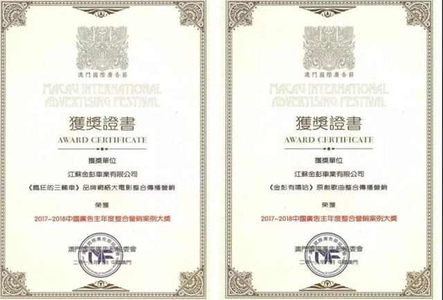 6月5日,金彭凭借原创歌曲《金彭有嘻哈》以及网络大电影《疯狂的三轮车》两部作品一举斩获澳门广告节“2017-2018年度中国广告主年度整合营销案例大奖”。澳门广告节,一直被誉为“亚太地区传播和营销领域重要的风向标”,是亚太地区及两岸三地广告创意和营销传播卓越成果的试金石,年度大奖在业内具有极高的公信力和号召力。